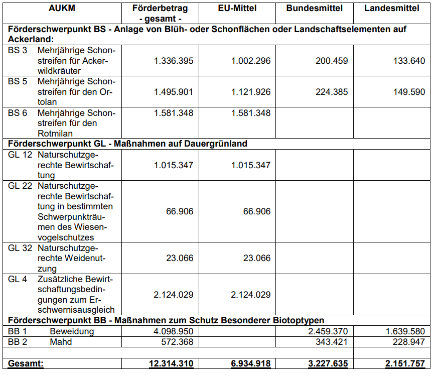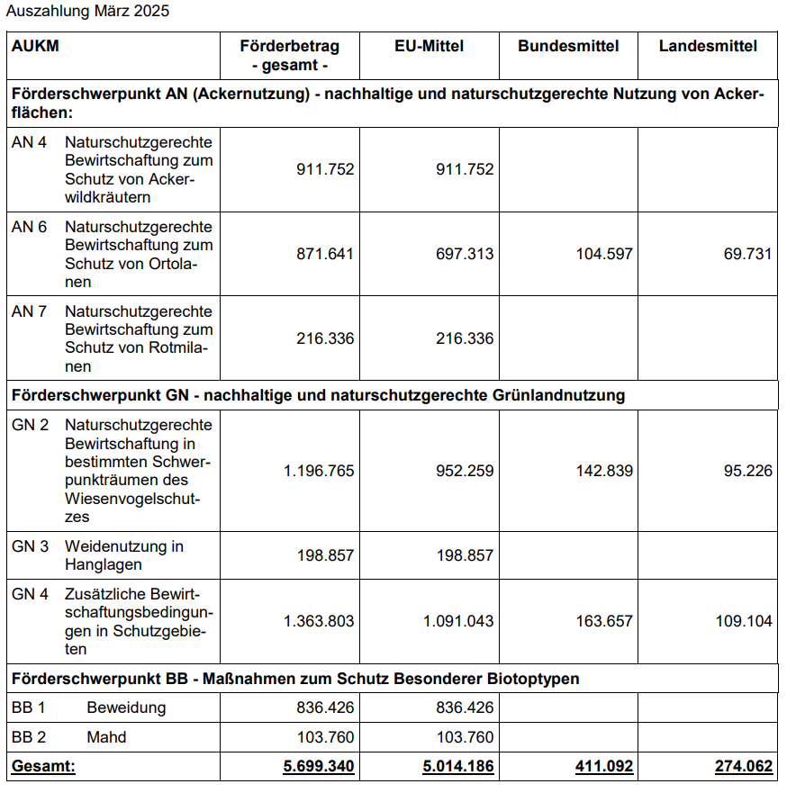 Für die vergleichbaren AUKM aus der vorherigen PFEIL-Förderperiode wurden im März 2025 folgende Zahlungen geleistet: